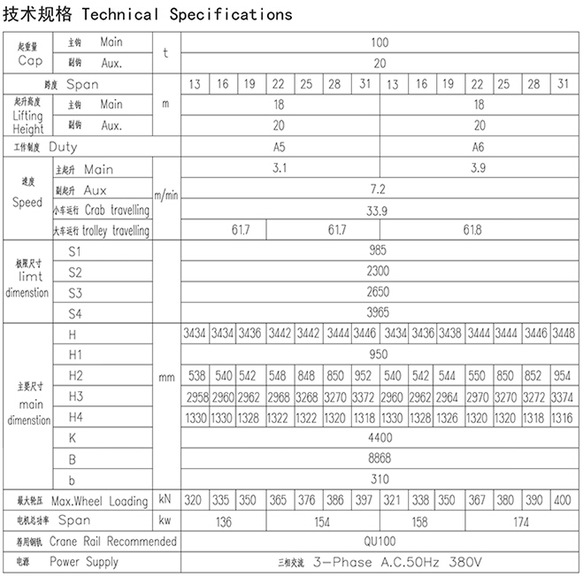 QD型100、20t吊钩桥式起重机